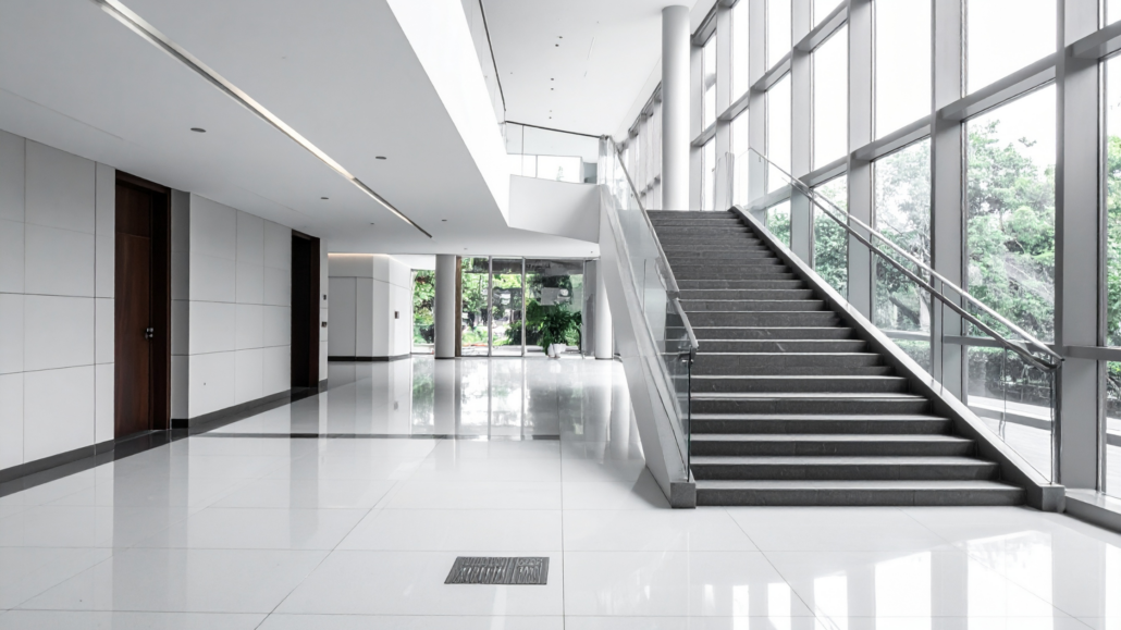 Modern commercial lobby with polished floors after Professional Post Construction Cleaning Services in Chicago